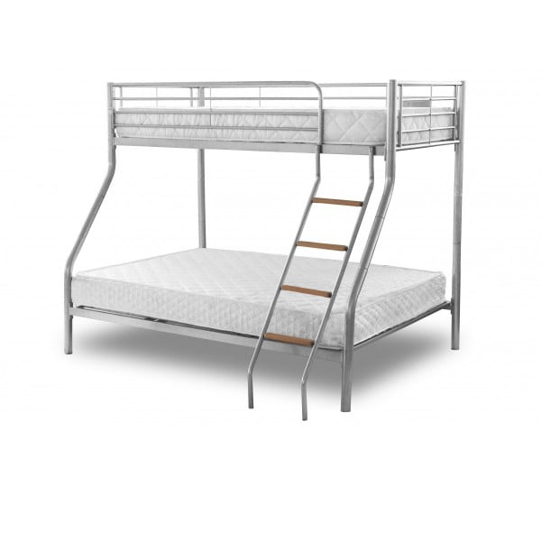 Alexa Triple Sleeper. A silver metal bunk bed which sleeps 3. With wooden steps. The bottom bunk has space for a double mattress, the top bunk is for a single mattress. Please note that mattresses are not included in the price.