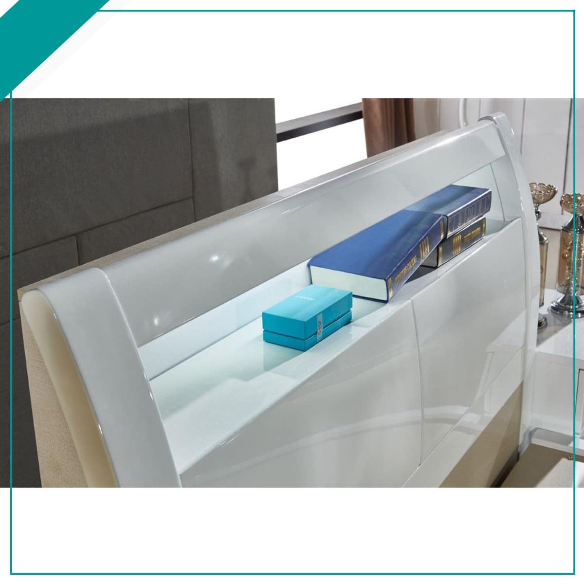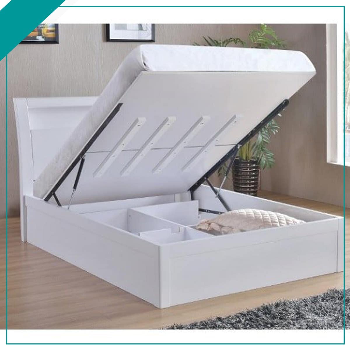 Stylish, Modern, High Gloss White Storage Bed frame with different types of headboards. This Fantastic low foot end sturdy bed frame comes with flat MDF wood base. This bed offers a storage area shown underneath the bed as in the picture.